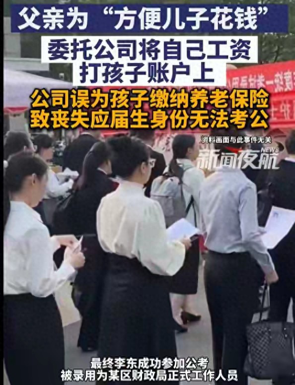 2025年,河北应届生李东(化名)在报考公务员时,因社保系统错误显示其曾有一家建筑公司的参保记录,导致其应届生身份被否定,丧失了公务员考试资格。经法院调查,该记录源于其父亲的一个无心之举:父亲因不熟悉手机转账,委托公司将工资直接打入儿子账户,公司财务误将李东登记为员工并缴纳了社保。