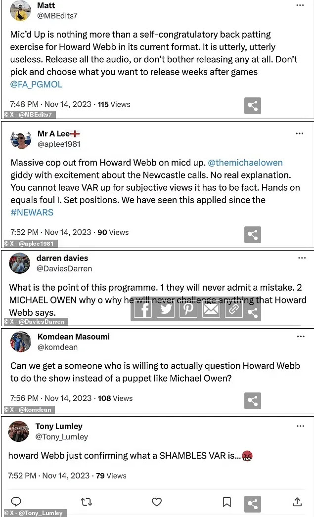 在昨晚的PGMOL首席裁判官霍华德-韦伯和前英格兰前锋迈克尔-欧文公开纽卡斯尔vs阿森纳的VAR录音后,社交媒体掀起轩然大波。一名观众在以前名为Twitter的X平台上发文表示,《Mic ' d Up》目前的形式只不过是韦伯自我祝贺的拍拍背练习。他直言:“这是完全、完全没有用的。发布所有音频,或者干脆不发布。不要在比赛过去几周后才选择你想要发行的内容。”