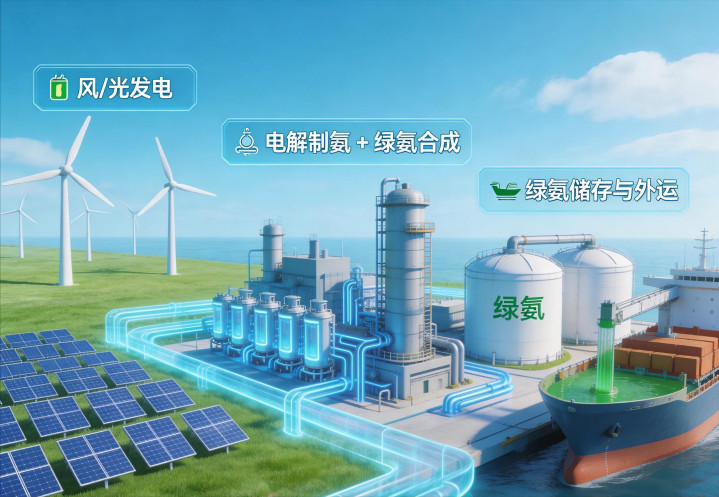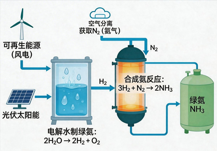 所谓绿氨,是指利用可再生能源(风、光)发电,通过电解水制取绿氢,再与从空气中分离的氮气,在高温高压下合成产生的氨( NH3 )。全过程零碳排放。